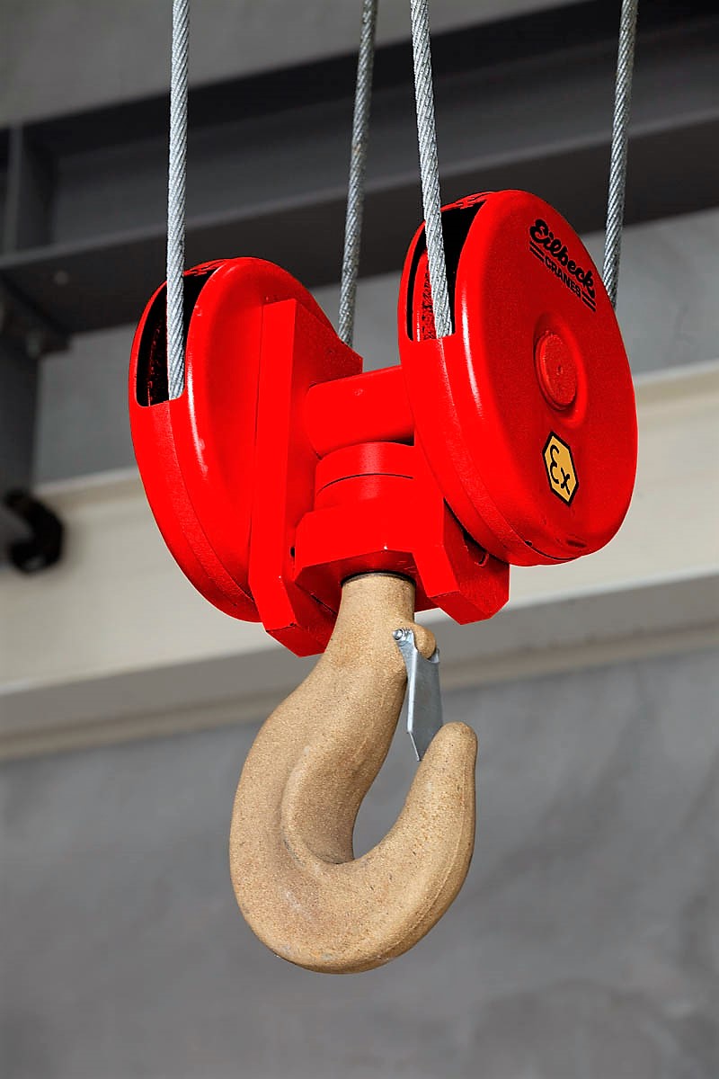 With many hazardous area cranes destined for harsh environments, the ES hoist’s modular construction lends itself to interchanging various parts as options to suit. Options include a grade 316 stainless steel pressure roller mechanism, guards, parts and fasteners for offshore/marine applications. Non-sparking features available are solid bronze wheels and guide rollers. Unique to the ES hoist is a bronze rope guide. Surface treatment options include full hot dip galvanizing hoist skeleton, followed by 240µm epoxy paint system. Where a hoist frame is required to be galvanized to preserve machining accuracy, the frame is pre-machined, and finish machined after treatment.